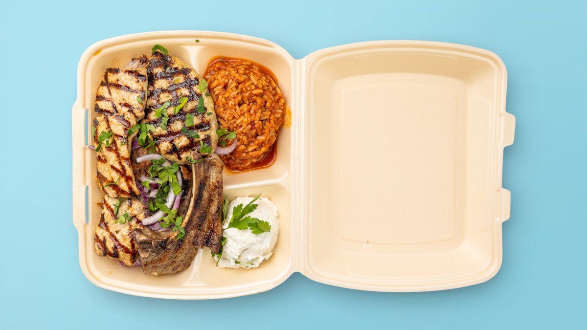 mit Lammkotelett vom Carre, Souvlaki vom Schwein, Gyros vom Schwein, Zuzuki, Reis und Tsatsiki