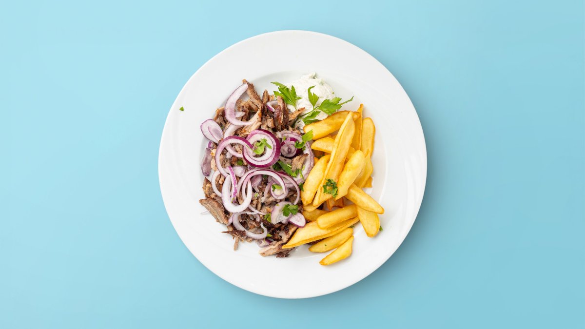 alle Gerichte werden mit Tsatsiki, Tomaten, Zwiebeln und Pommes frites zubereitet
