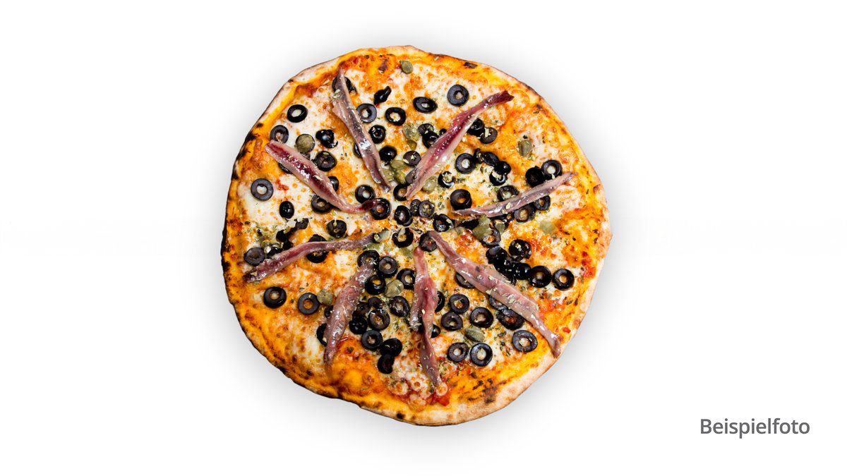 mit Sardellen, Knoblauch, Zwiebeln, Peperoni und schwarzen Oliven