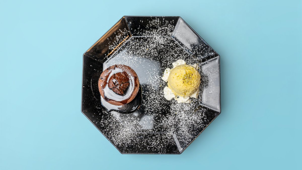 Schokoladen-Souffle mit Vanilleeis Das Gericht wurde mit Schokolade zubereitet und kann Spuren von (verschiedenen) Nüssen enthalten