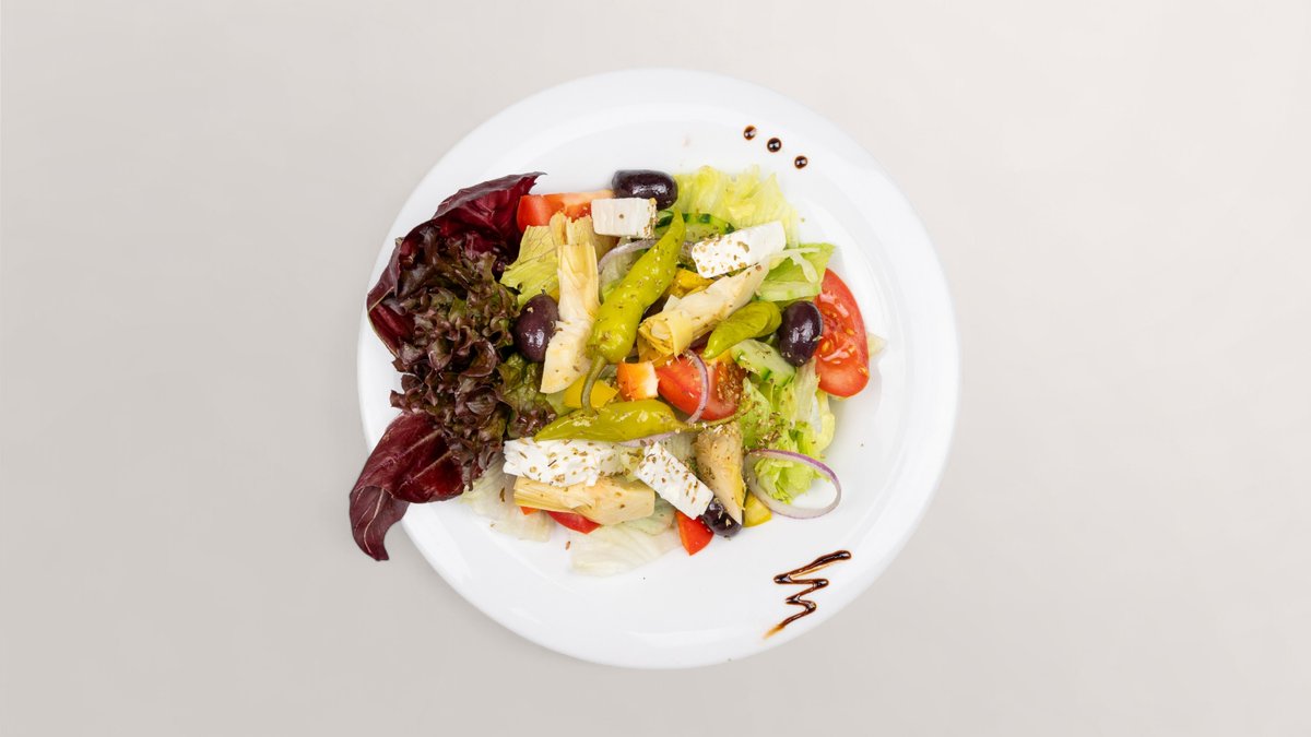 mit grünem Salat, Gurken, Tomaten, Artischocken, Paprika, Oliven, Peperoni, Schafskäse und Zwiebeln