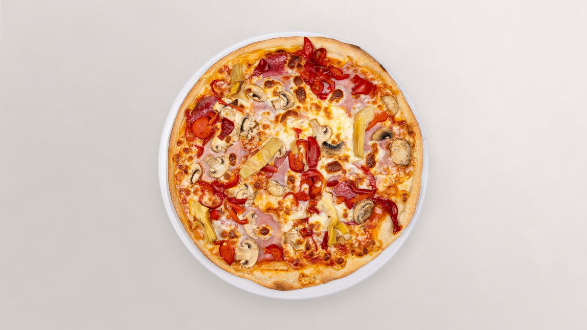 mit Tomatensoße, Käse, Salami vom Schweinefleish, Paprika, Champignons, Kapern, Sardellen, Hirten Kochschinken vom Schweinefleisch und Artischocken