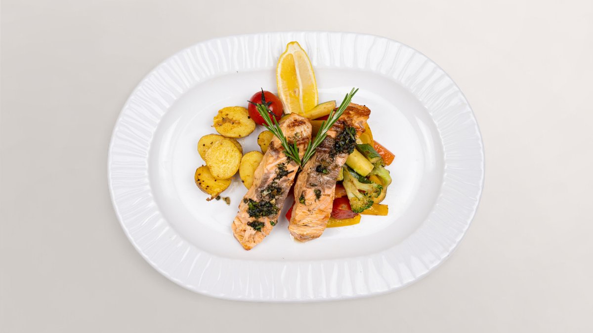 Lachs vom Grill mit Rosmarin-Kartoffeln und Gemüse