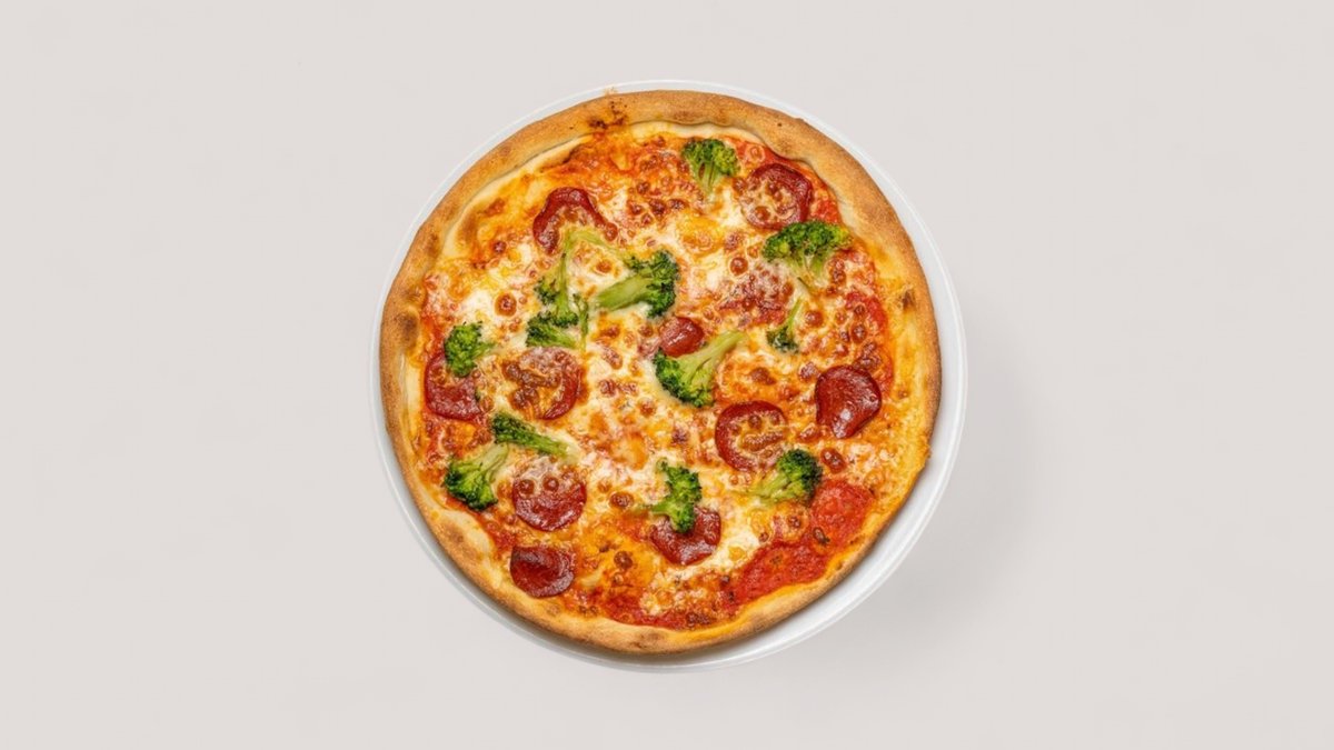 mit Tomatensoße, Mozzarella, scharfer Salami vom Schweinefleish und frischem Brokkoli