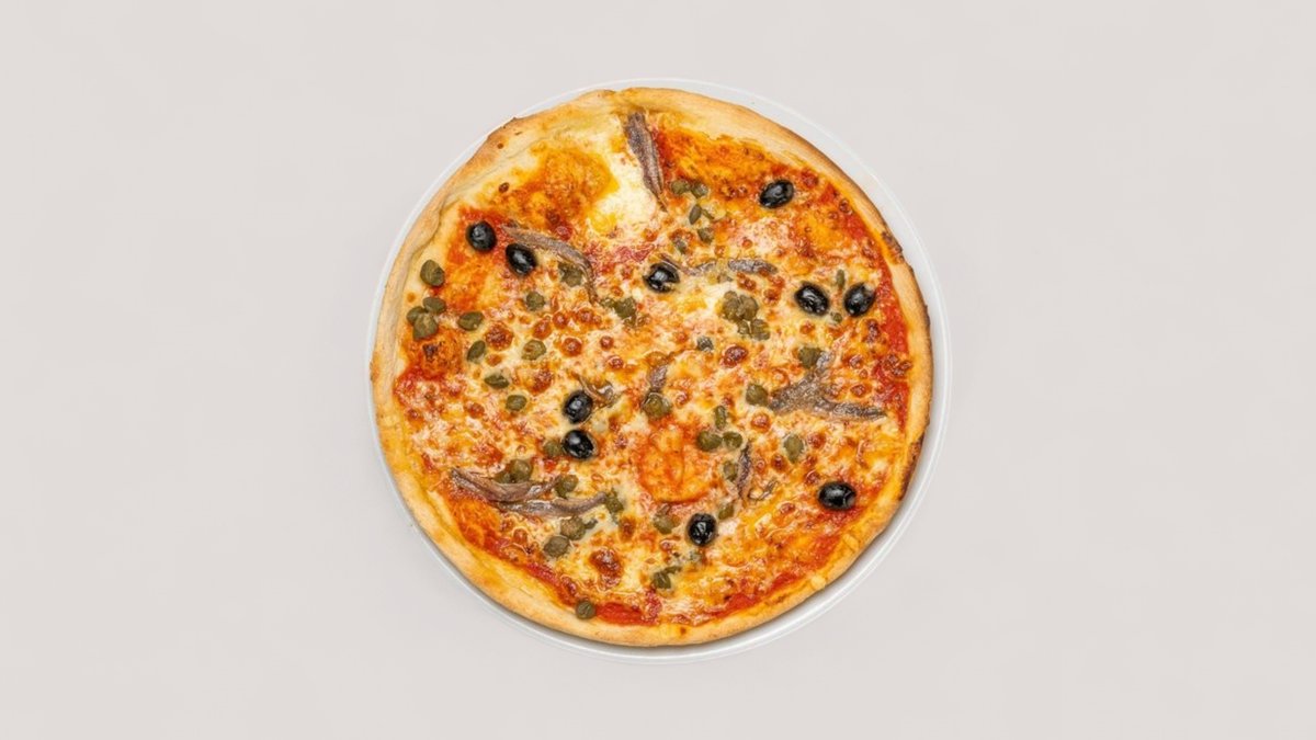 mit Tomatensoße, Käse, Paprika, Peperoni, Sardellen, Kapern, Knoblauch und Oliven
