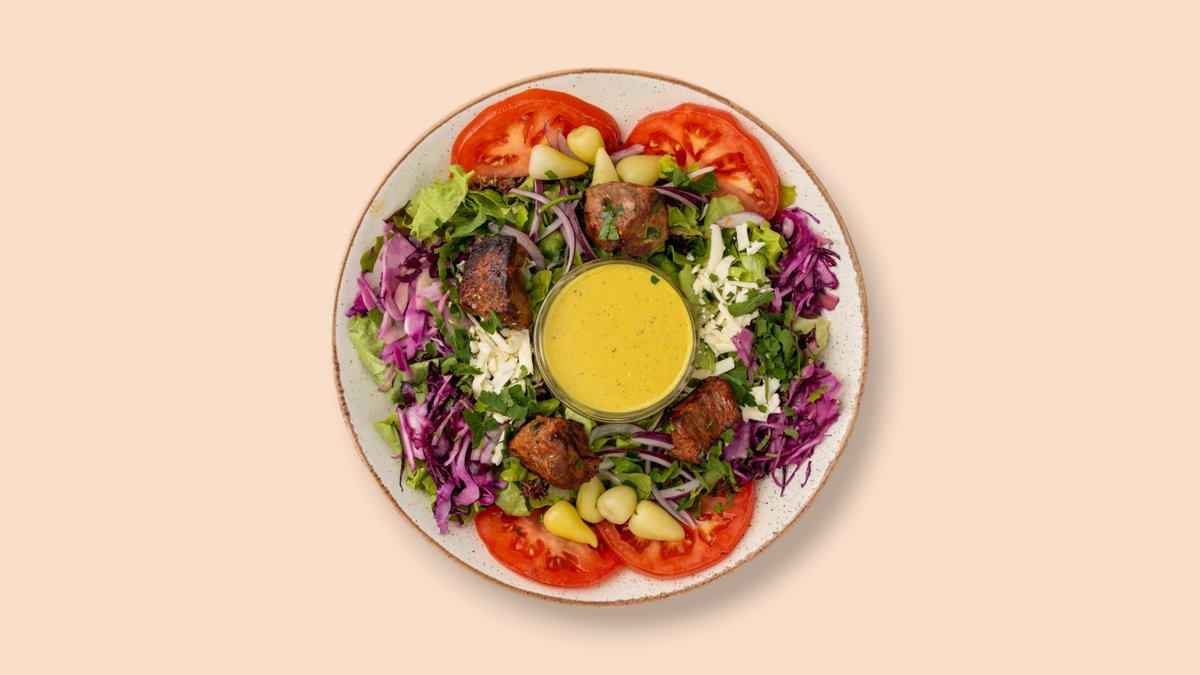 Blattsalate der Saison, Gurke, Tomate, Zwiebeln, hausgemachtes Dressing und gegrillter Lammfleisch am Spieß