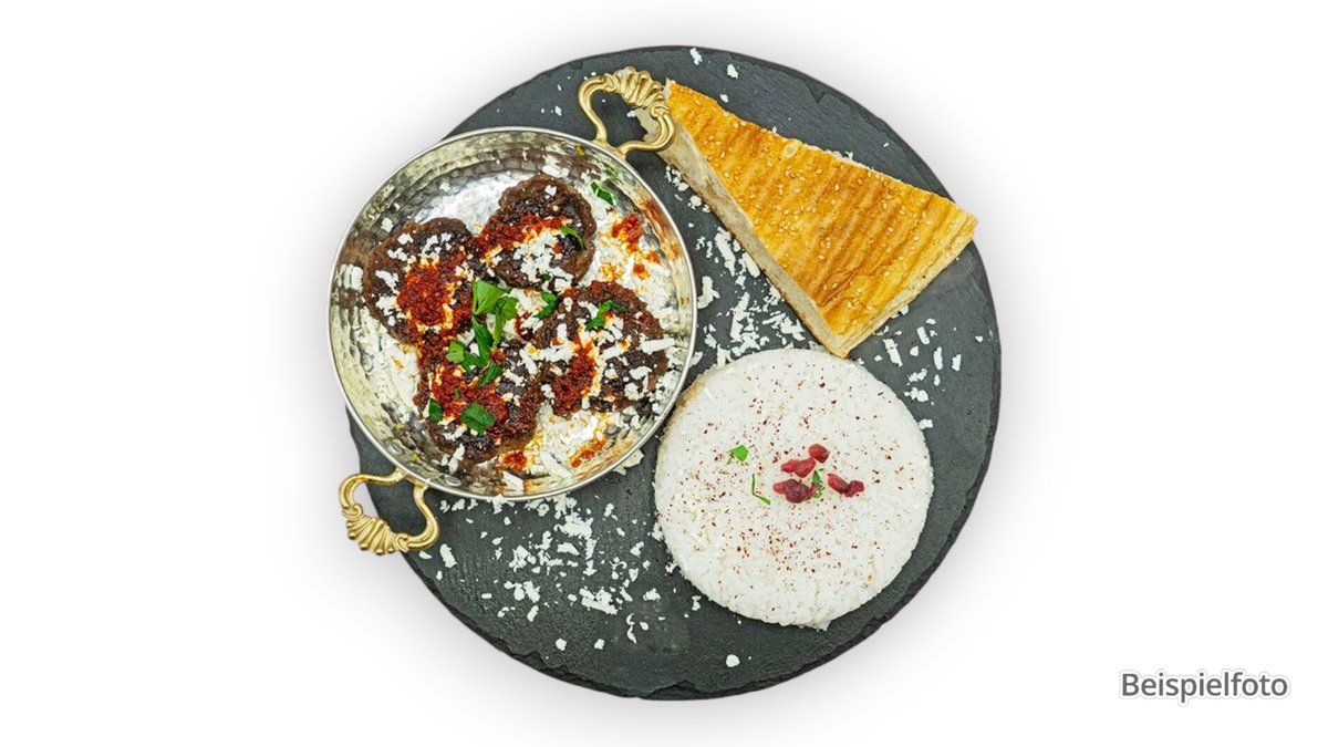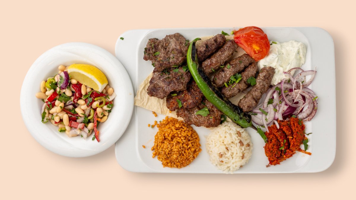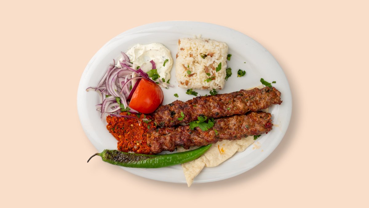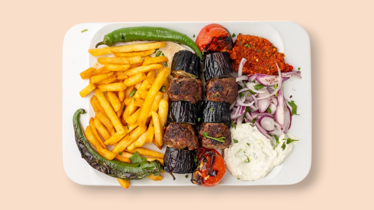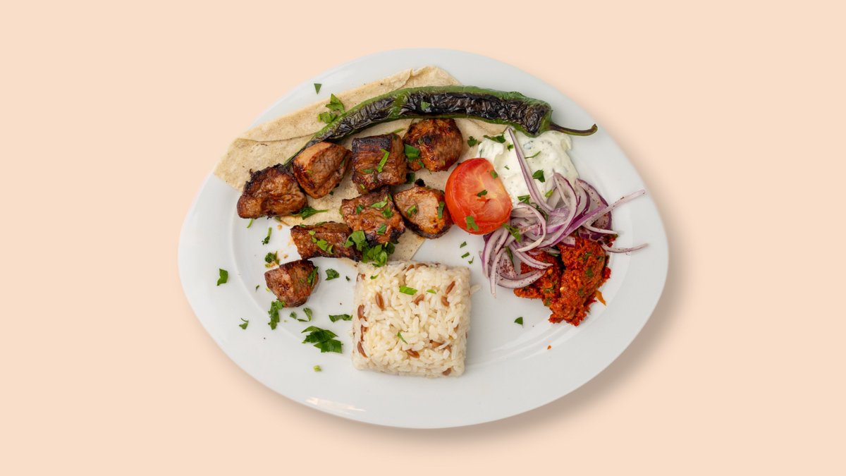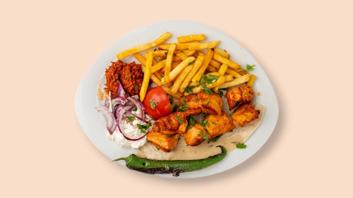2 Stück am Spieß gegrillt mit Cacık, Antep Ezme, Salat, dazu Reis und Bulgur oder mit Pommes frites
