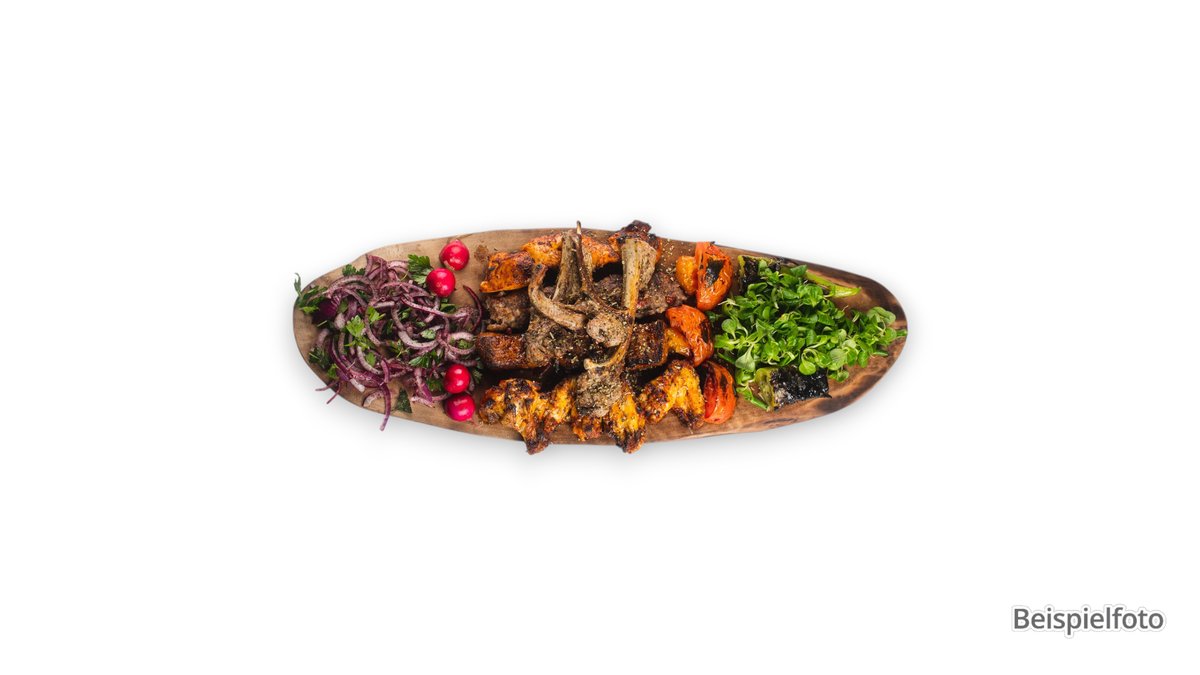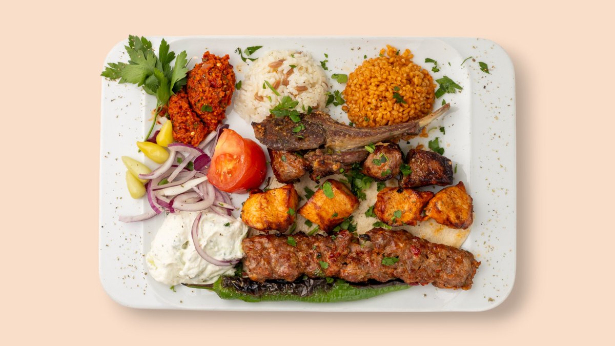 gegrillter Lammspieß, Hähnchenspieß, Lammhackspieß und Lammkoteletts, mit Salat, Cacık, Antep Ezme, dazu Reis und Bulgur oder Pommes frites