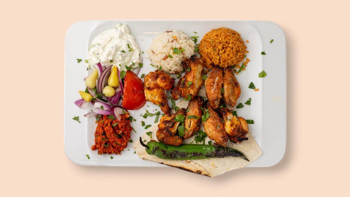 Hähnchenspieẞ, Hähnchenflügel, Hähnchenkotelett mit Cacık, Antep Ezme, Salat, dazu Reis und Bulgur oder mit Pommes frites