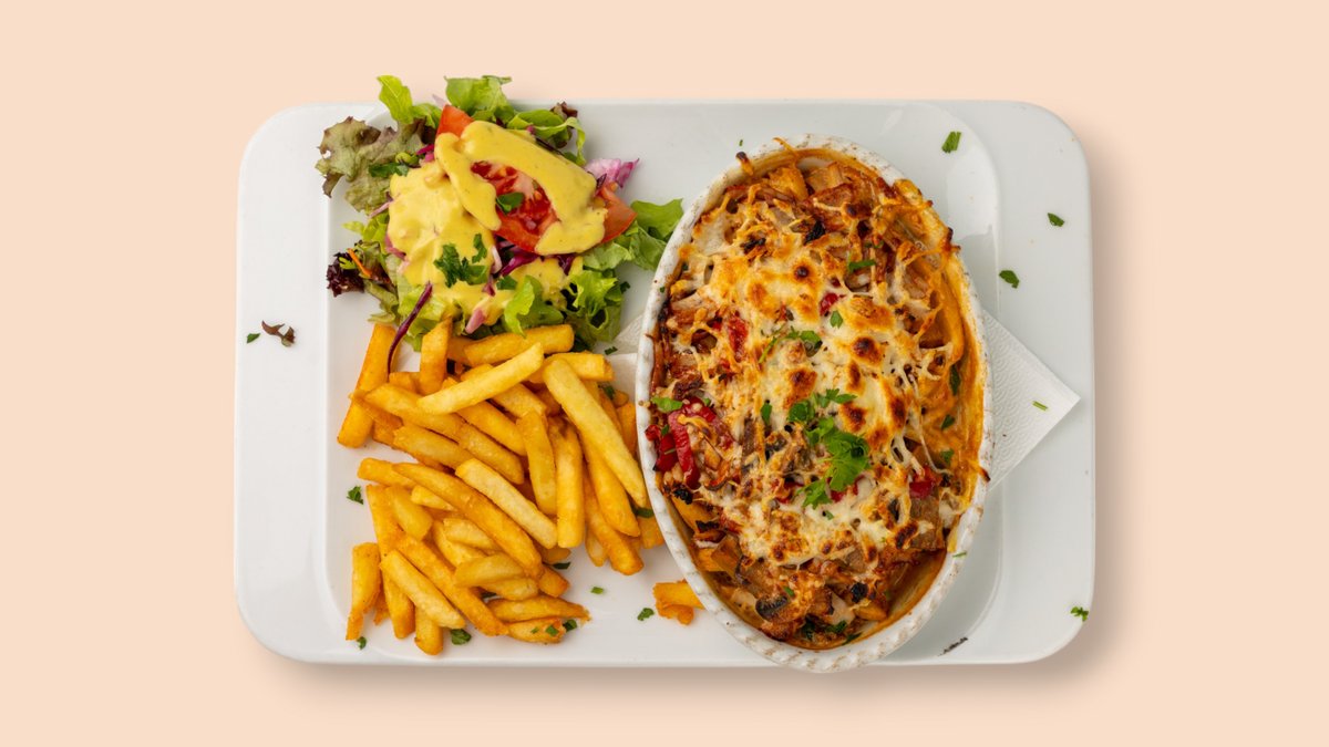 Döner in Sahne Champignon Soße mit Käse überbacken dazu Salat und Pommes frites