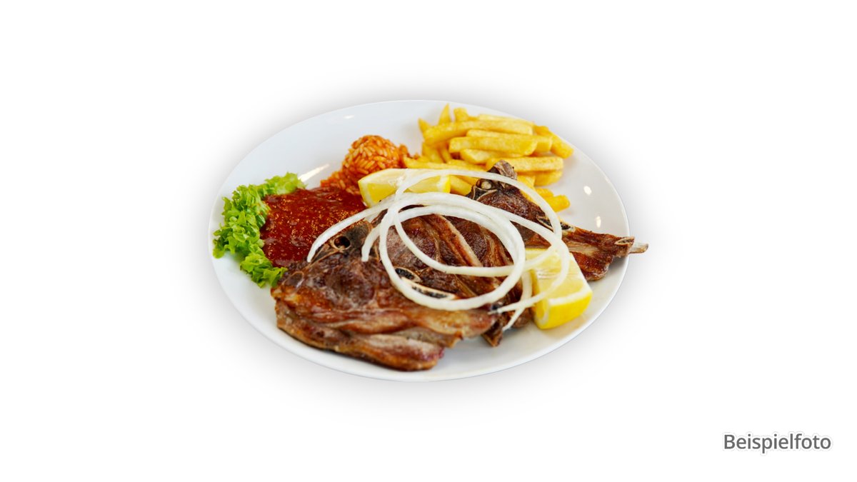 4 Stück Lammkoteletts mit Cacık, Antep Ezme, Salat, dazu Reis und Bulgur oder mit Pommes frites