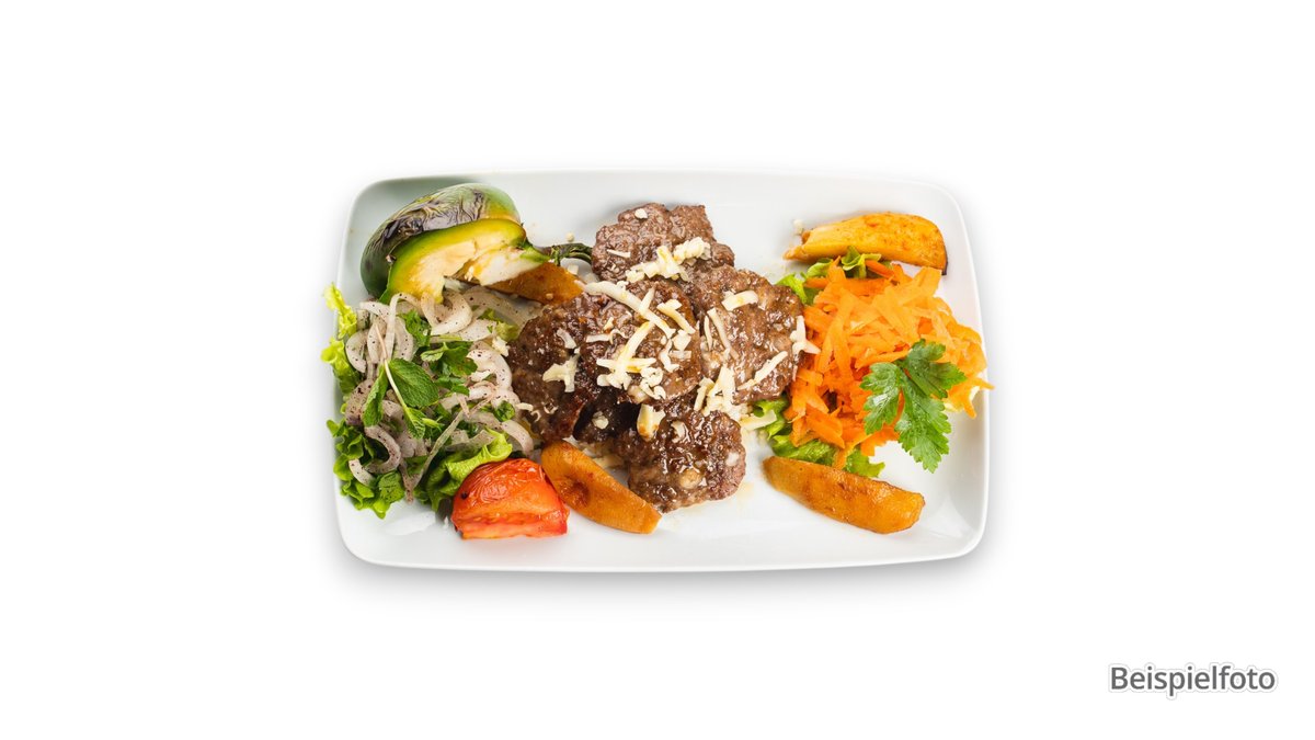 2x Izgara Köfte 2x Akcaabat Köfte 5x Inegöl Köfte dazu Reis, Bulgur, Antep Ezme, Cacik und Bohnensalat