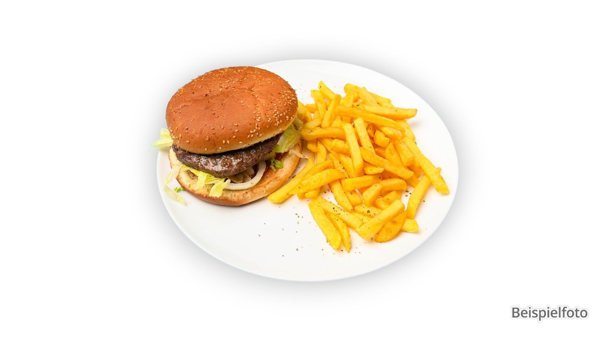 gegrilltes Rinderhack im hausgemachtem Burgerbrötchen, Salatblatt, Tomate, Burgersoße und Pommes frites