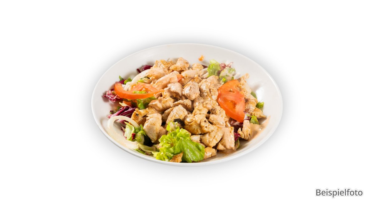 Blattsalate der Saison, Gurke, Tomate, Zwiebeln, hausgemachtes Dressing und gegrillter Hähnchenfleisch am Spieß