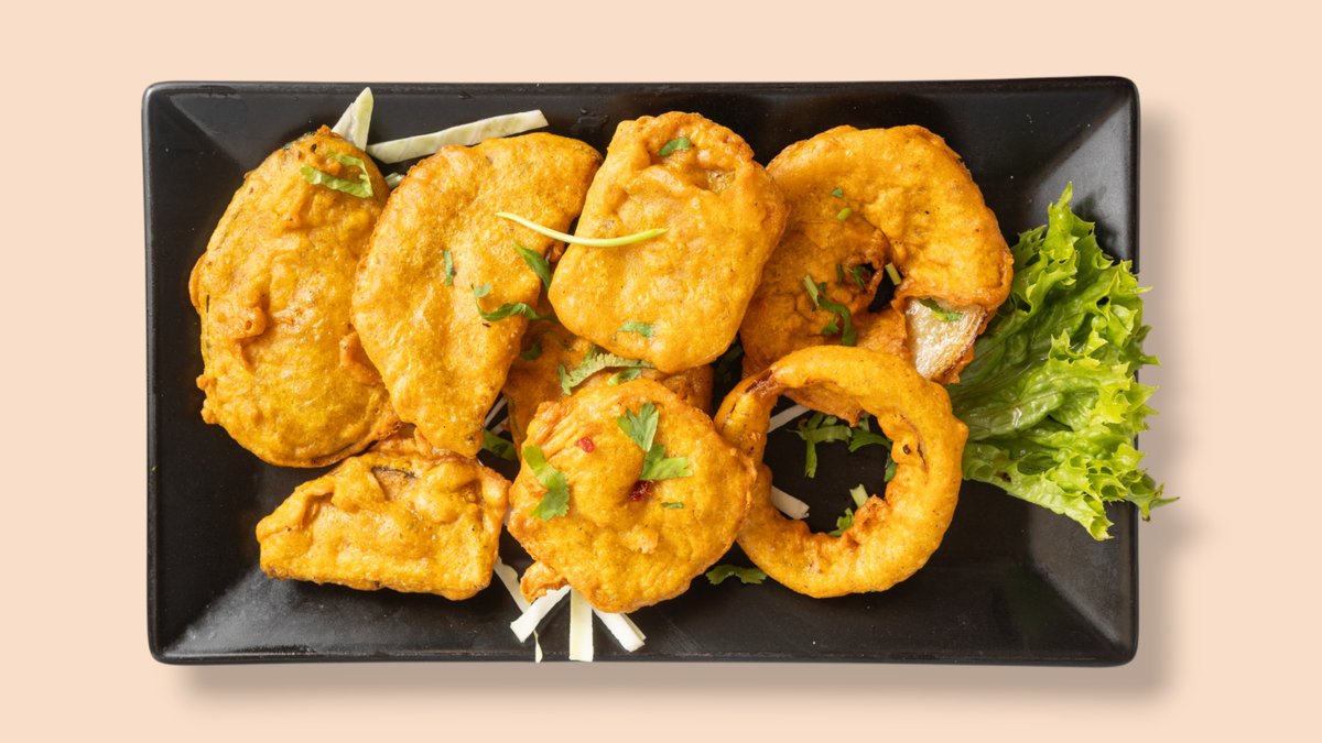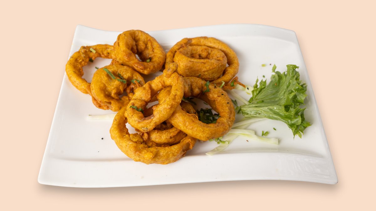 Zwiebelringe, umhüllt mit Kichererbsenteig und anschließend frittiert