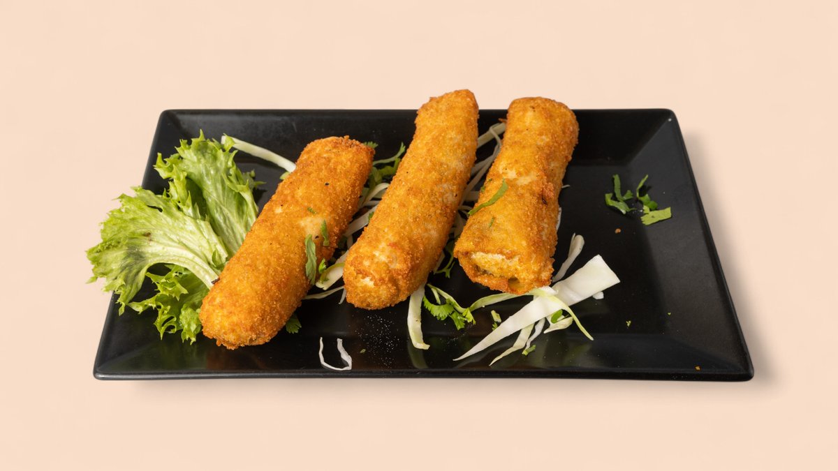 panierte, frittierte, indische Teigrollen gefüllt mit Kartoffeln, Karotten, Porree, Zwiebeln und grünen Erbsen-nach südindischer Art