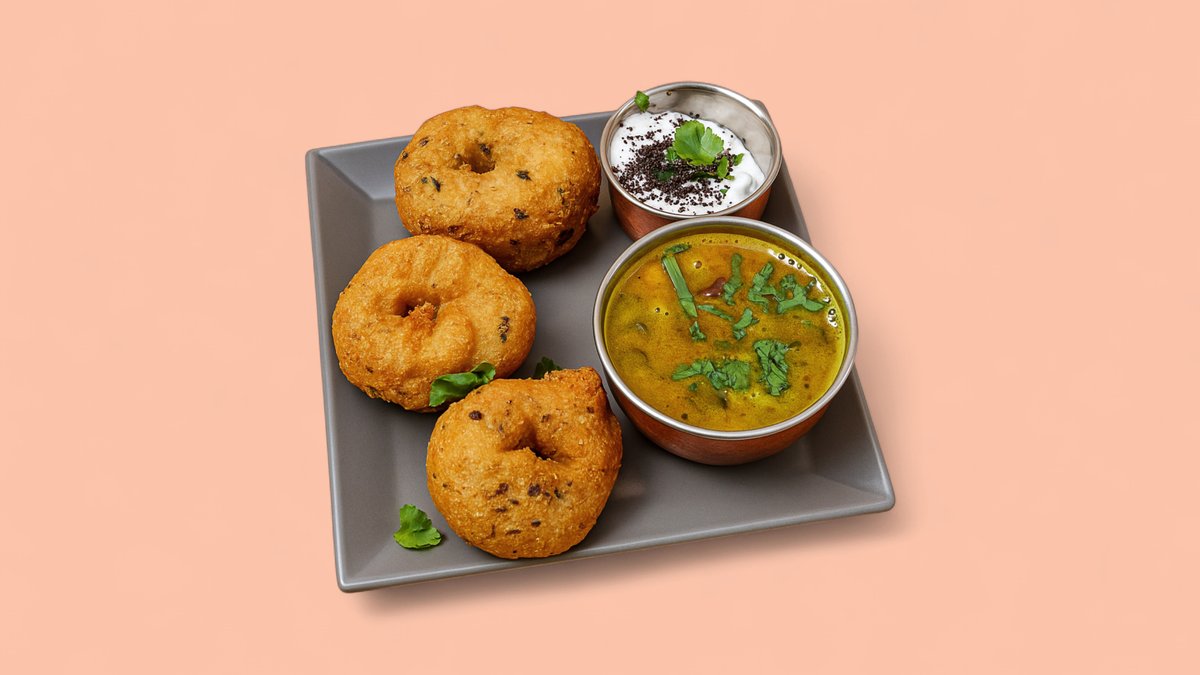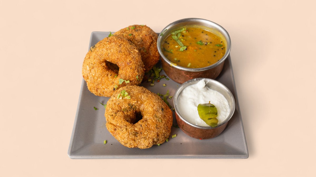 3 Stück knusprige Linsendonuts mit Sambar und Kokos-Chutney