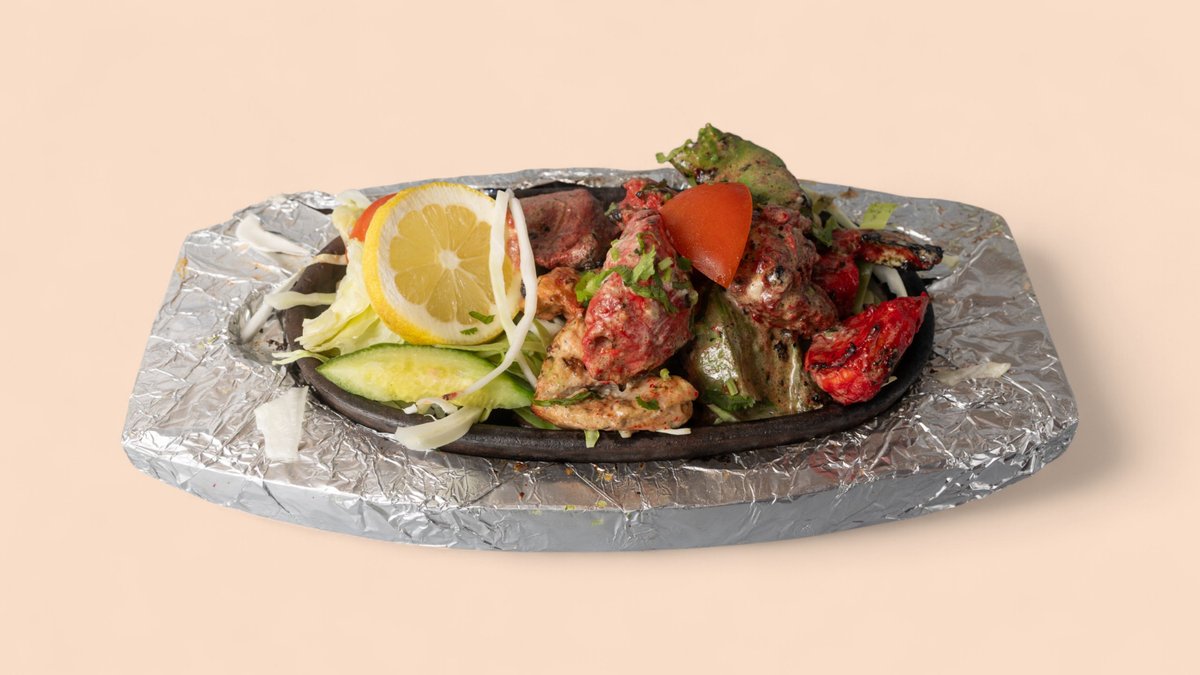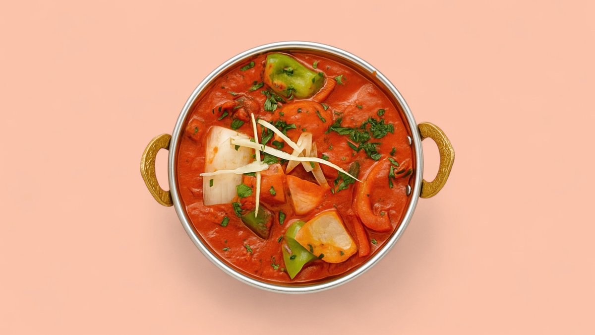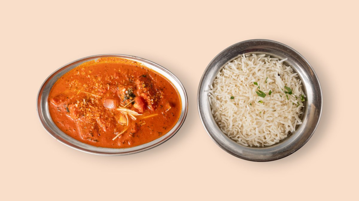 in Safran-Joghurt mariniert, gegrillt, mit Paprika, Zwiebeln, Tomaten, Ingwer in feiner Sahnesoße