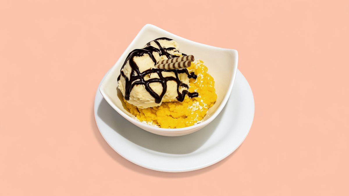 Pudding aus Yammehl, Honig, Kokosnuss, Safran und Cashewnüssen