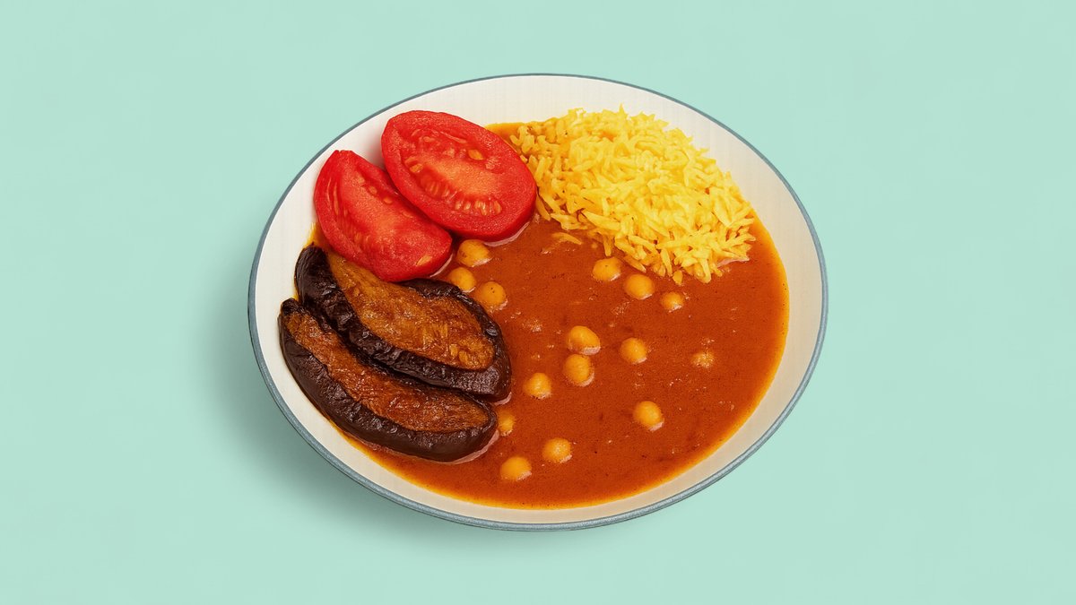 mit Lammfleischstückchen, Auberginen, gelben Erbsen, Tomatensoße und Safran-Basmatireis