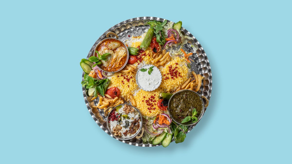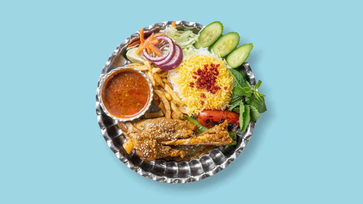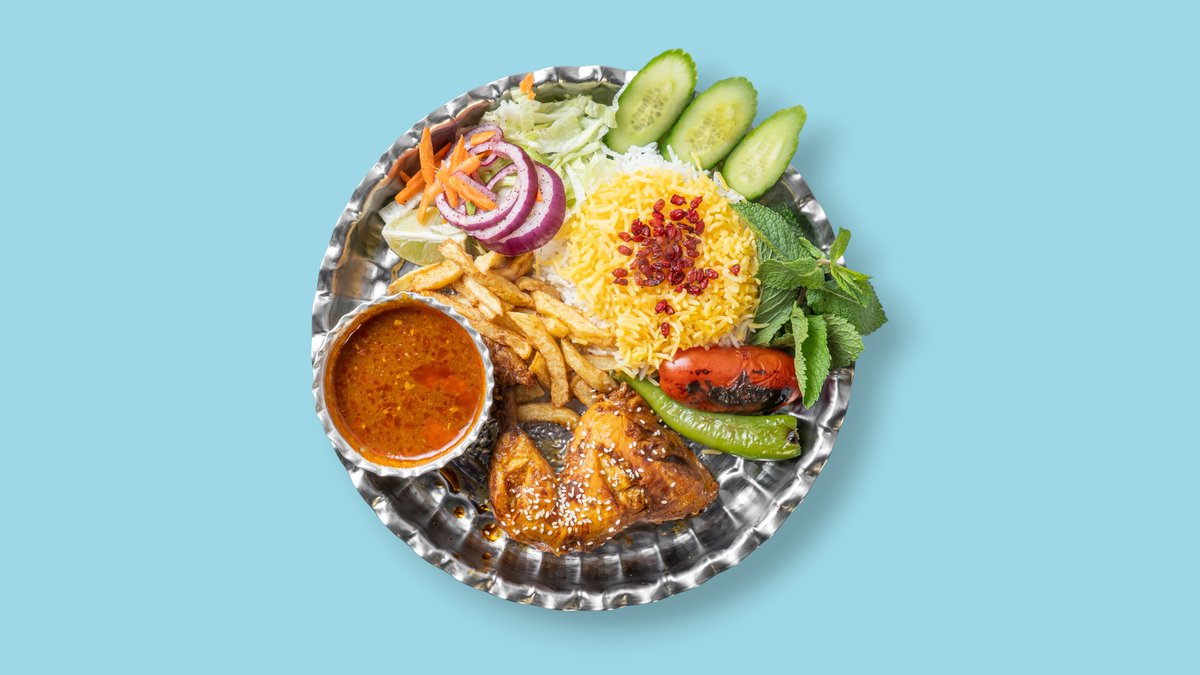 für 4 Personen mit Hähnchenkeule, Lammhaxe, 4x Lammhackspieße, 1x Hähnchenspieß, Basmatireis, Safranreis, gegrillten Tomaten, Peperoni, Zwiebeln, Zitrone und Spezialsoße