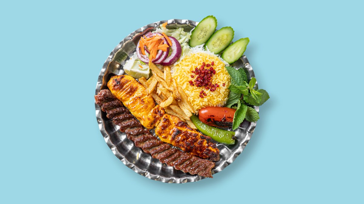 für 2 Personen mit 1x Lammfiletspieß, 1x Hähnchenspieß ohne Knochen, 2x Lammhackspieße, Basmatireis, Safranreis, gegrillten Tomaten, Peperoni, Soße, Zwiebeln und Zitrone