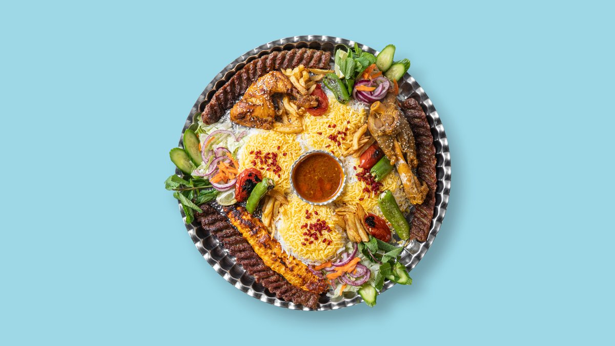 für 3 Personen mit 3x Lammhackspieß, 2x Hähnchenspieß, 1x Lammfiletspieß, Basmatireis, Safranreis, gegrillten Tomaten, Peperoni, Zwiebeln, Zitrone und Lammhaxensoße