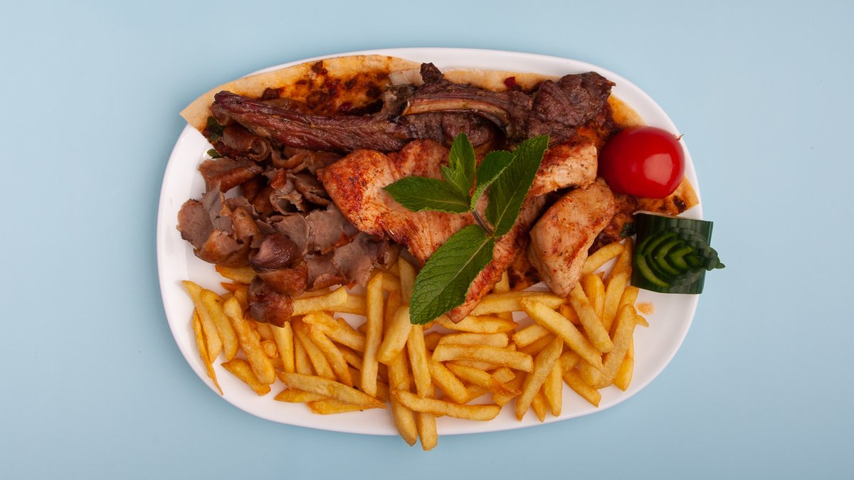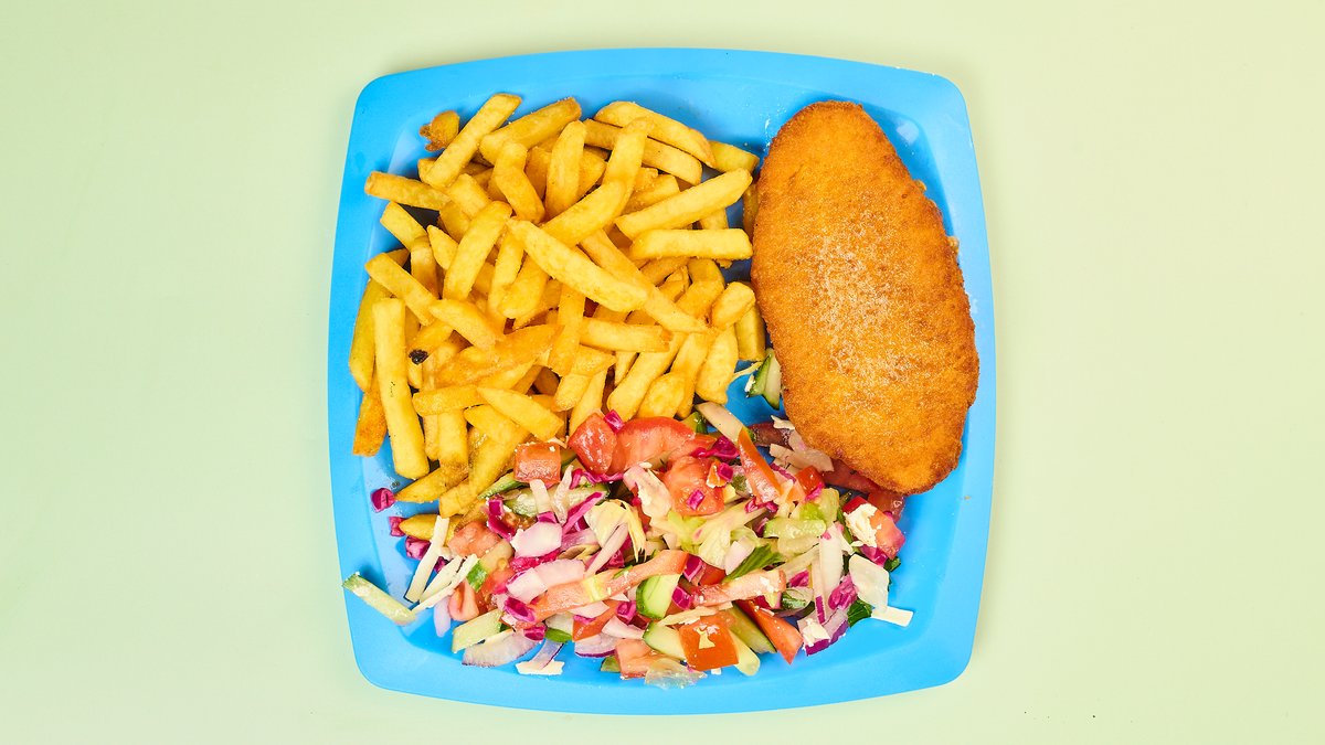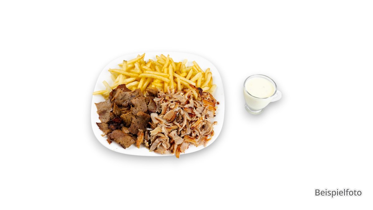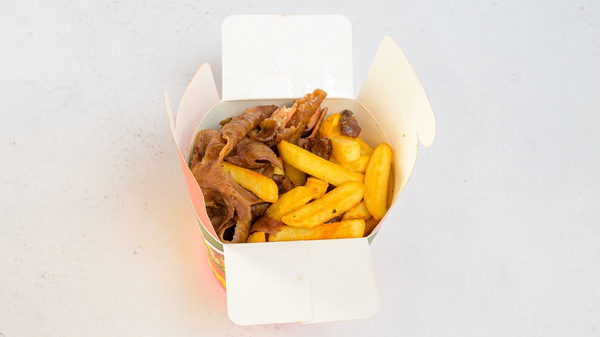 mit Pommes frites, Soße und einer Fleischsorte deiner Wahl