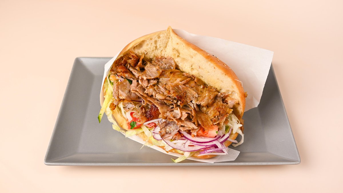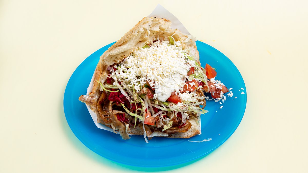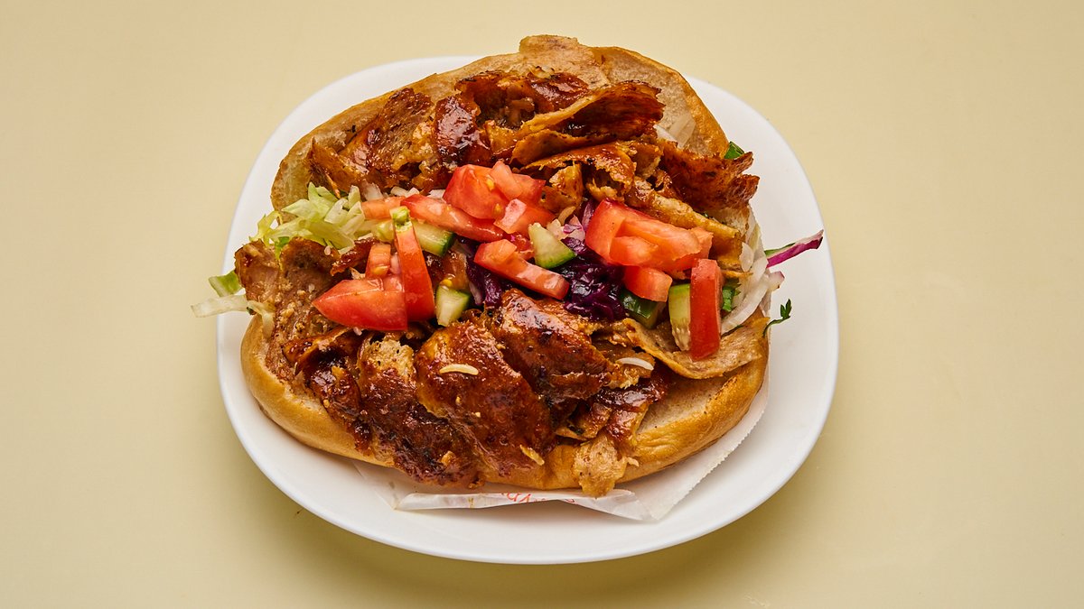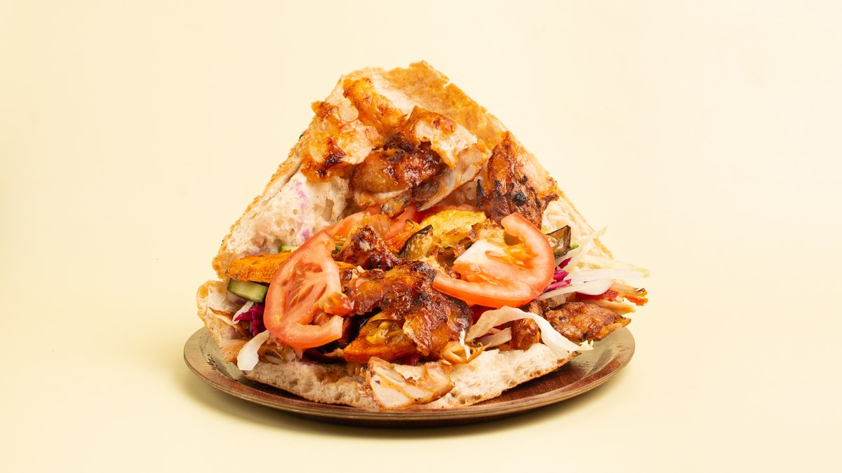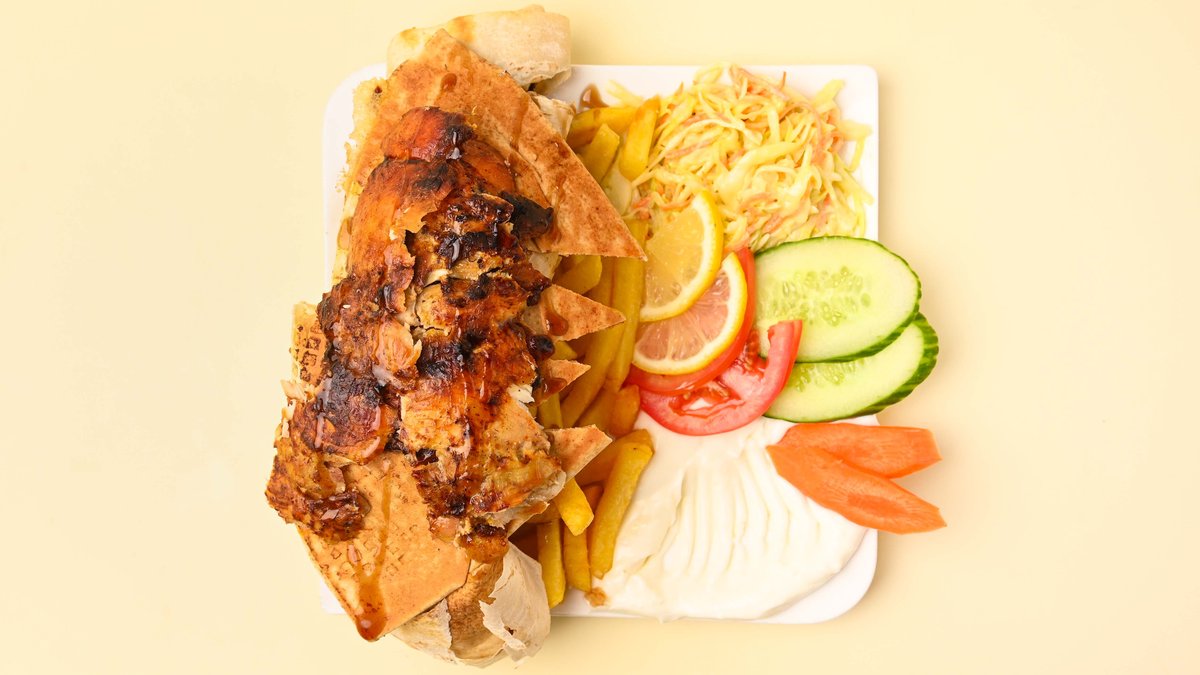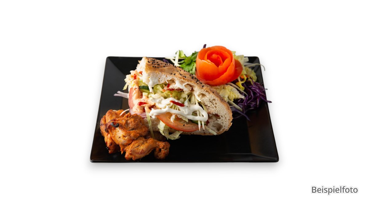 Fladenbrot mit Hähnchen, Tomaten, Gurken, Zwiebeln und Knoblauchsoße