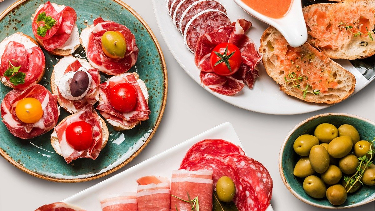 Herzhafte Tapas, frische Meeresfrüchte und gegrilltes Fleisch. Kleine Häppchen und große Teller