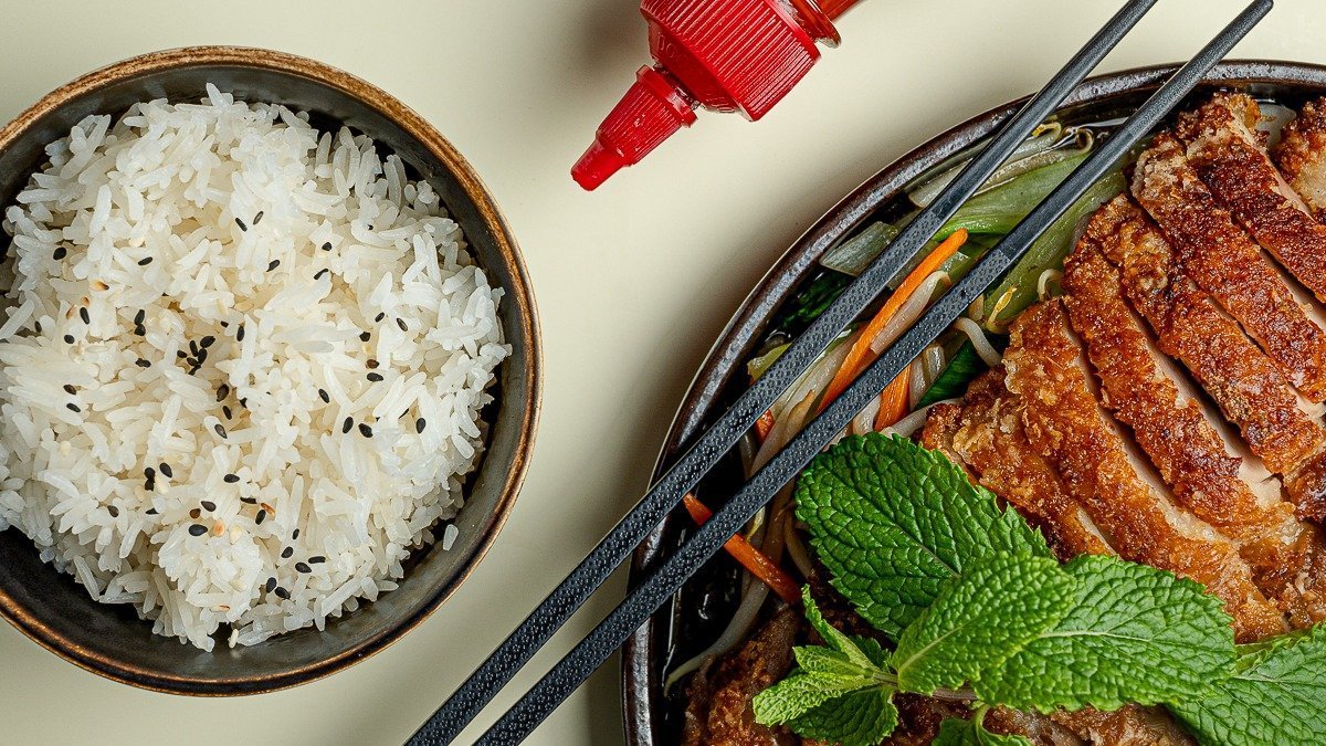gebackene Ente mit saisonalem Gemüse und einer hausgemachten pikanten Soße, serviert mit Duftreis