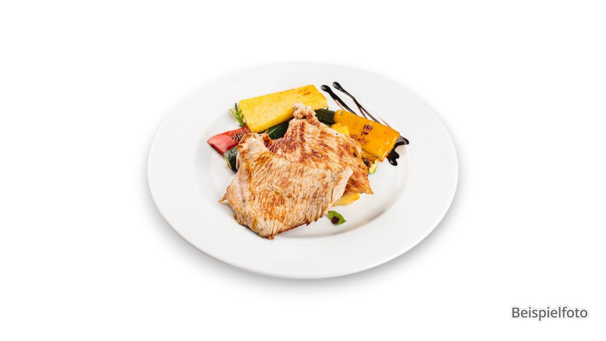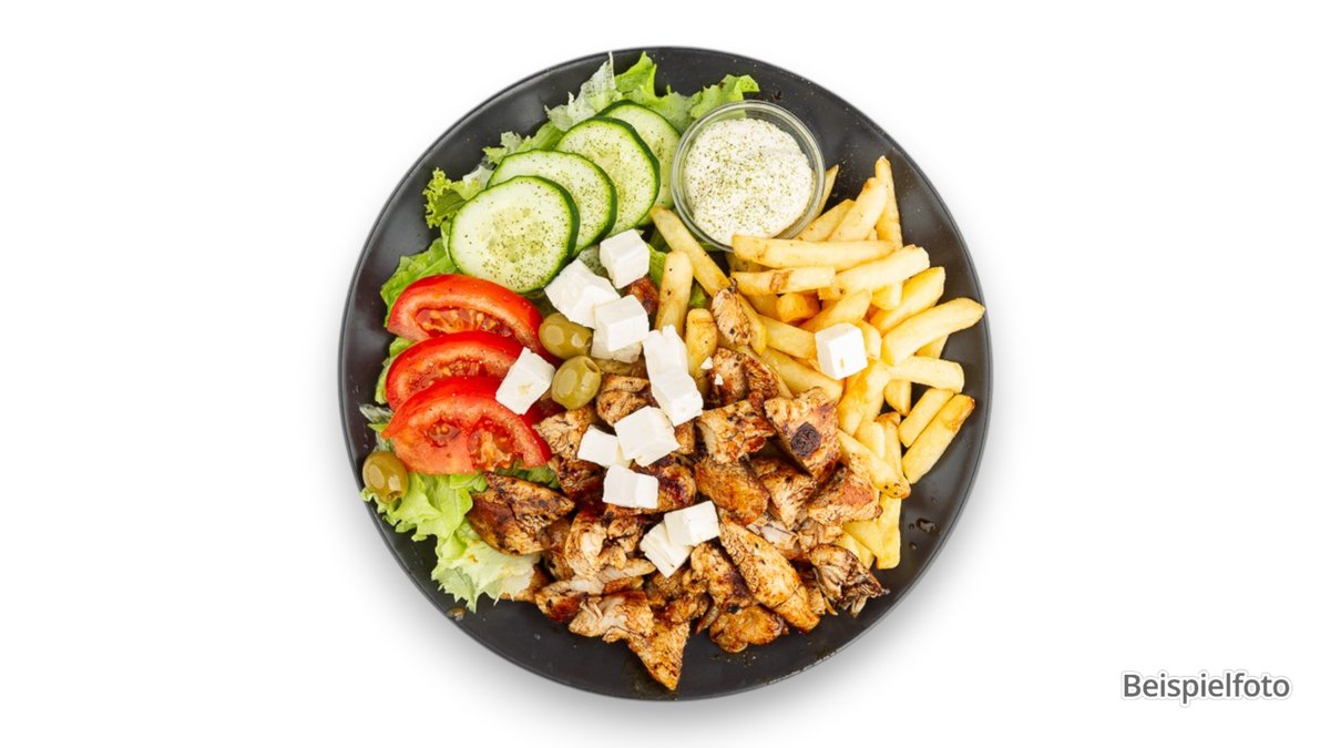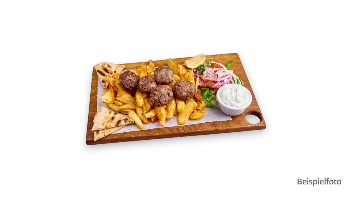 alle Gerichte werden mit Pommes frites und Tsatsiki serviert („Kinderteller Chicken Nuggets” wird mit Soße serviert)