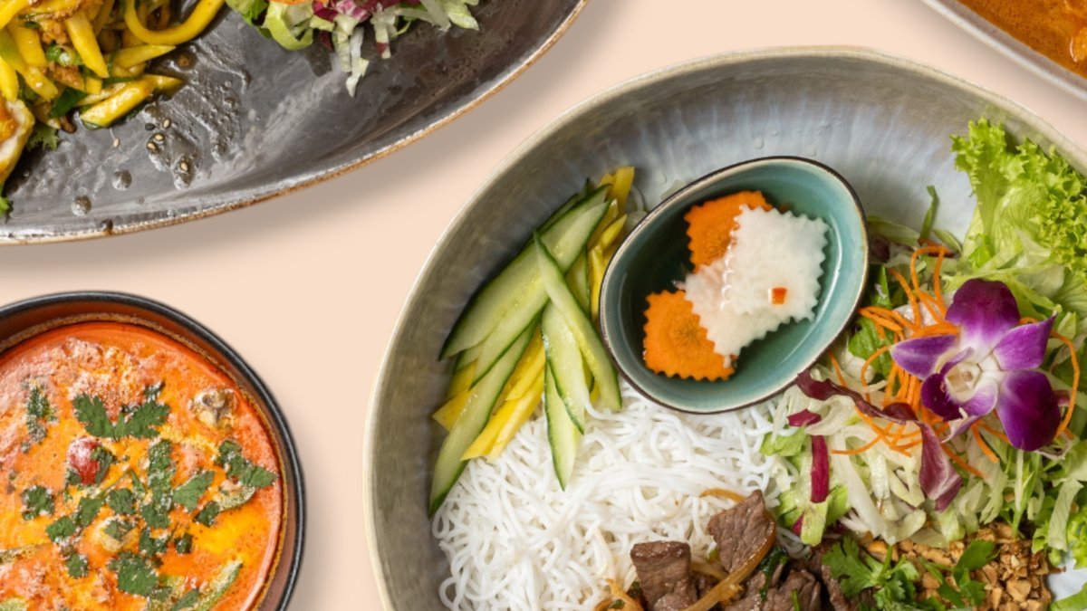 Reisfadennudeln mit Curry-Kokosnusssoße, Wildkräutersalat, Koriander, Thai-Basilikum, gerösteten Erdnüssen und gerösteten Röstzwiebeln