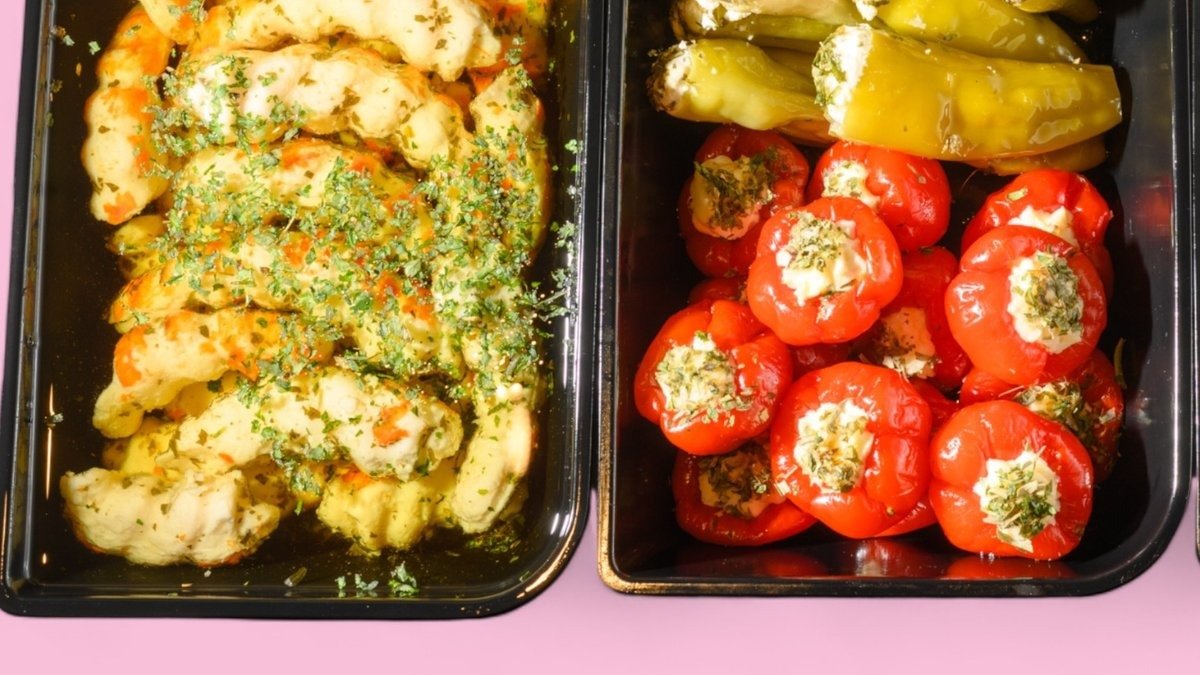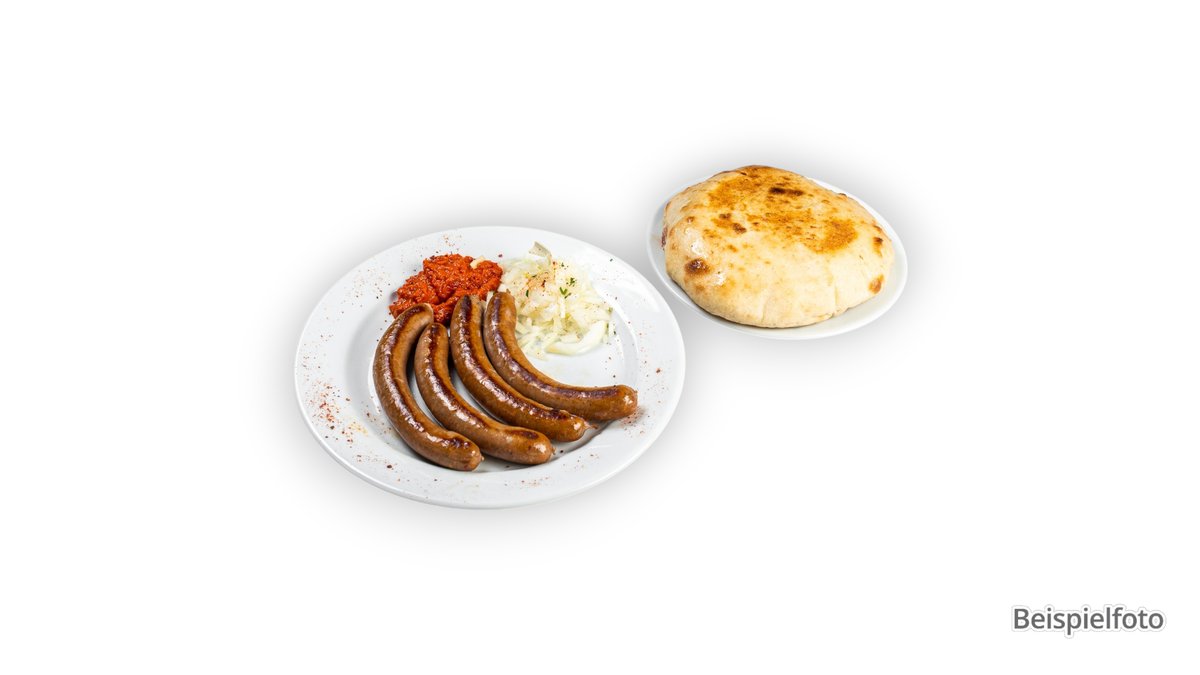 scharf bestrichen mit Paprika-Dip, gefüllt mit Knoblauchwurst vom Rind, Oliven, würzigem Schafskäse, Peperoni und frischen Tomaten