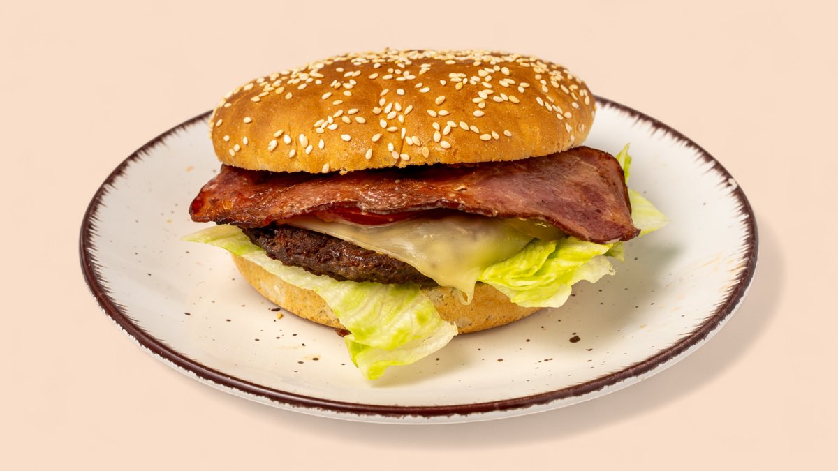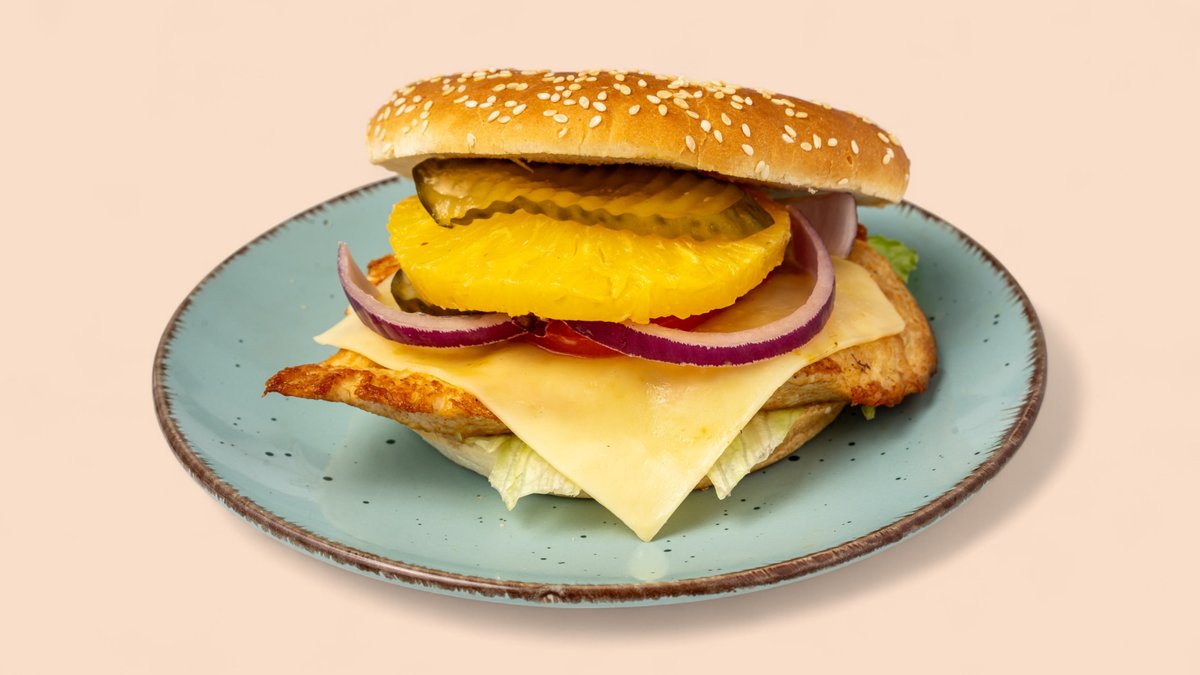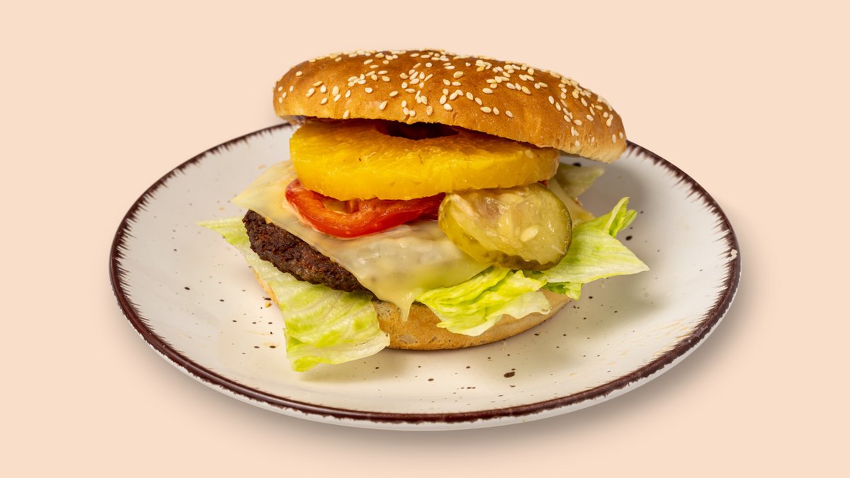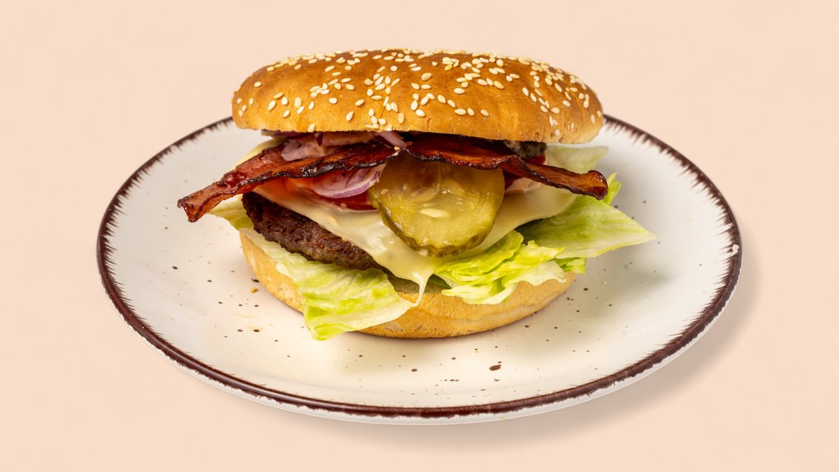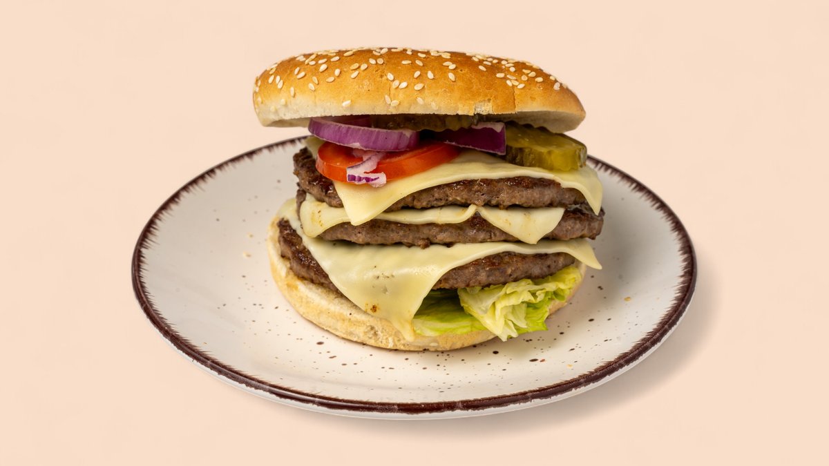 mit doppeltem Smashpatty, Cheddar Käse, Zwiebeln, Gurken und Ketchup-Senf-Soße