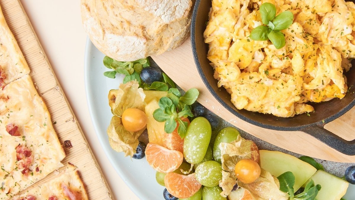 mit Rührei, Salatbeilage, Obst und einem Brötchen deiner Wahl