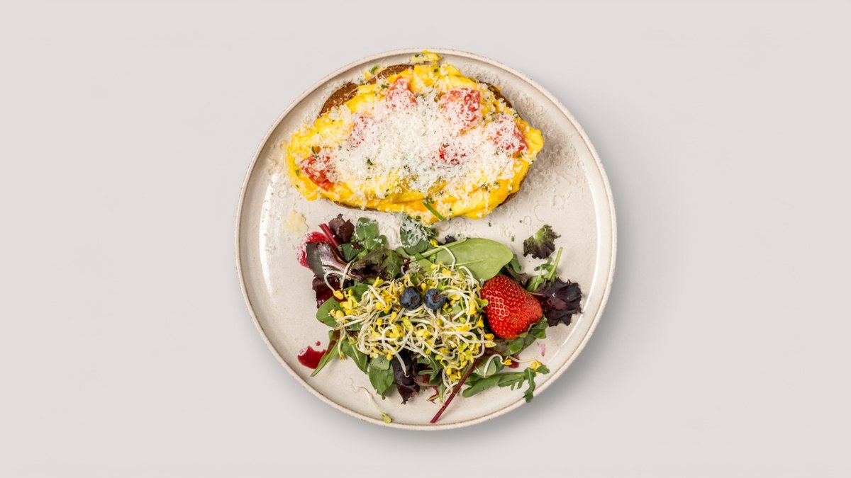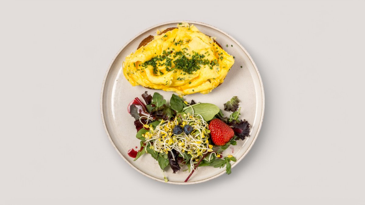 Rührei auf geröstetem Sauerteigbrot, Babyblattsalat und Sprossen
