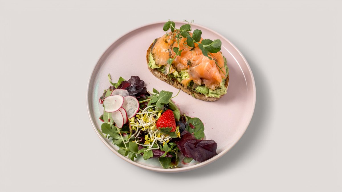 gravierter Lachs auf cremiger Avocado, geröstetem Sauerteigbrot, Babyblattsalat und Sprossen