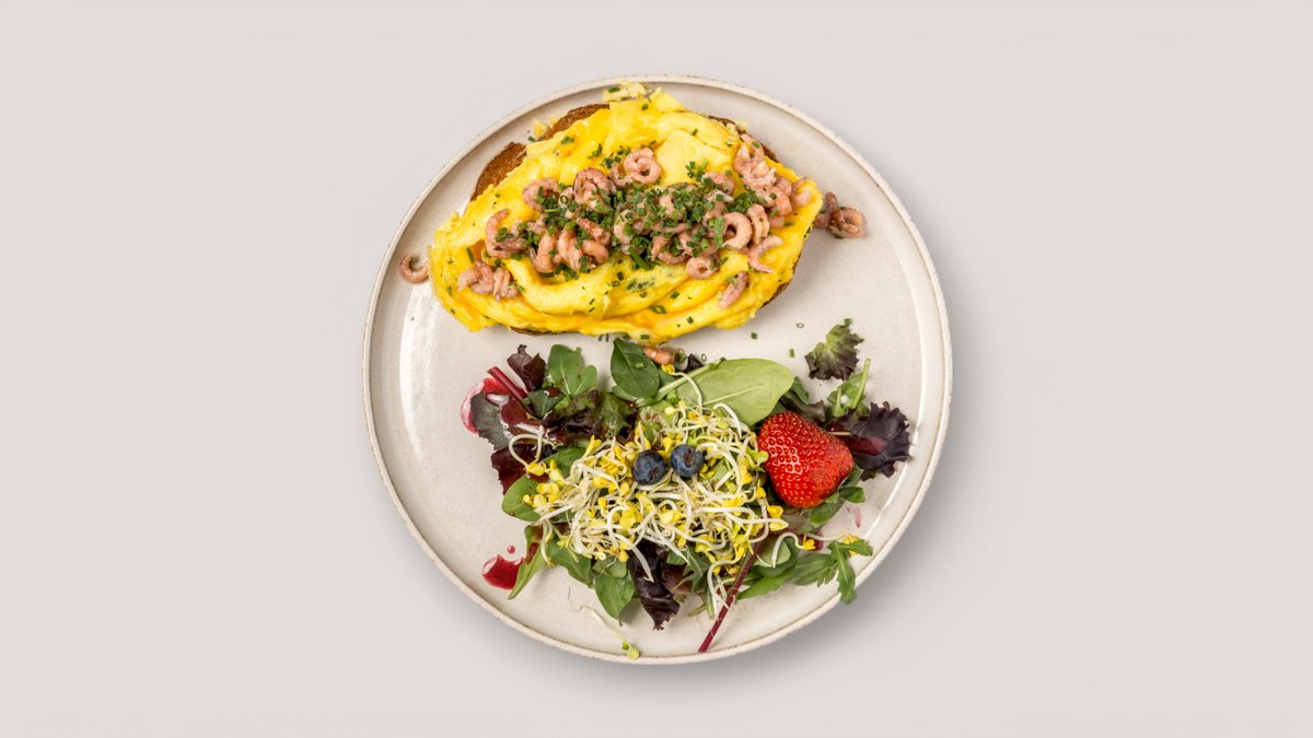 Rührei auf geröstetem Sauerteigbrot, Babyblattsalat, Sprossen und Nordseekrabben
