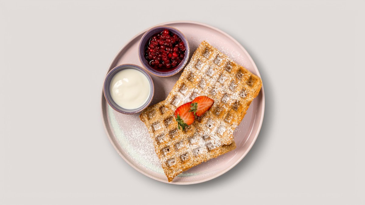 frisch gebackene Waffeln mit Sojajoghurt und hausgemachtem, kaltgerührtem Preiselbeerkompott