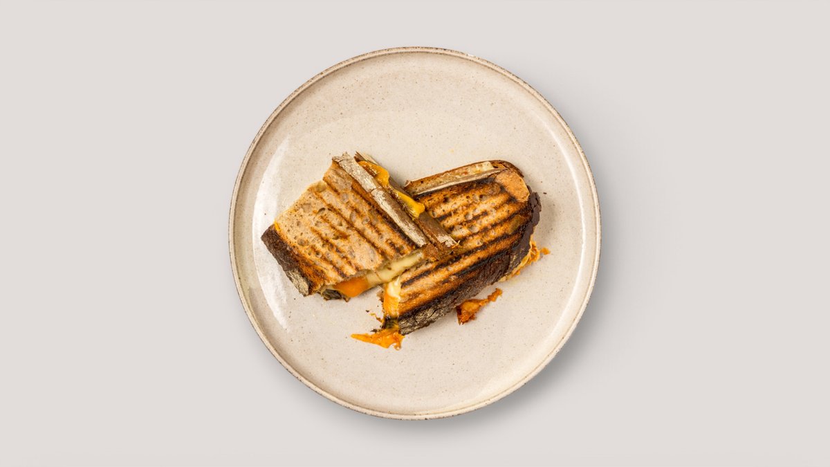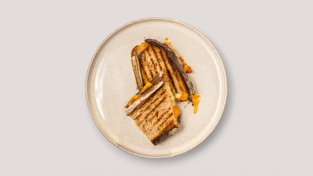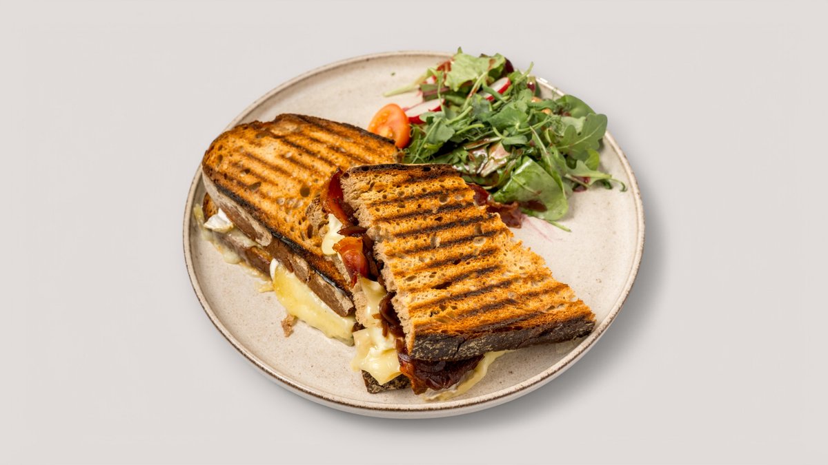 gegrilltes Sandwich mit Cheddar, Gouda, Schnittlauchkäse, karamellisierten Zwiebeln, Sprossen, Babyblattsalat und Gemüsecreme