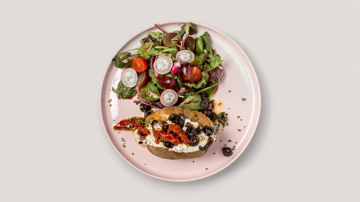 mit Salat, veganer Basilikumcreme, getrockneten Tomaten und schwarzen Oliven