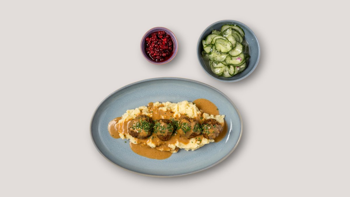 traditionelle schwedische Rindfleischbällchen mit Kartoffelpüree und Preiselbeerkompott, serviert mit Gurkensalat