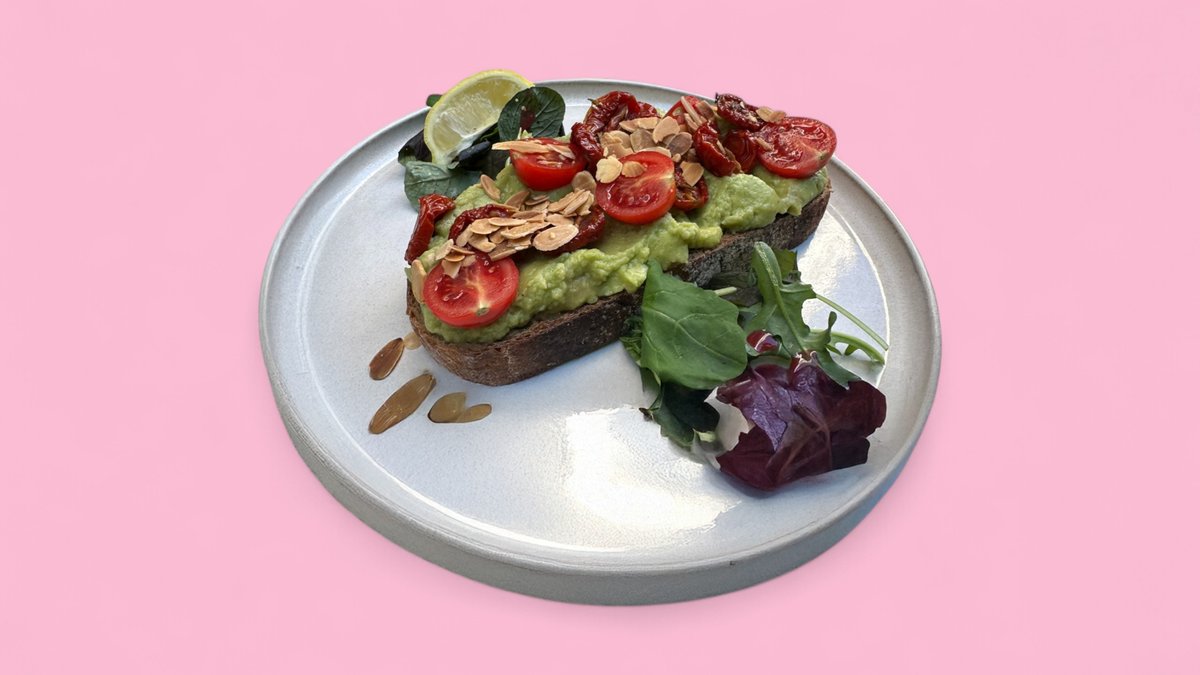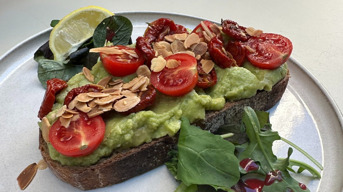 Smashed Avocado, geröstete & frische Tomaten & geröstete Mandeln auf Sauerteigbrot