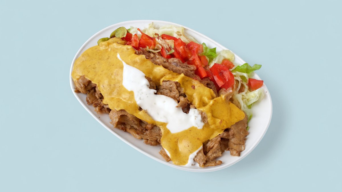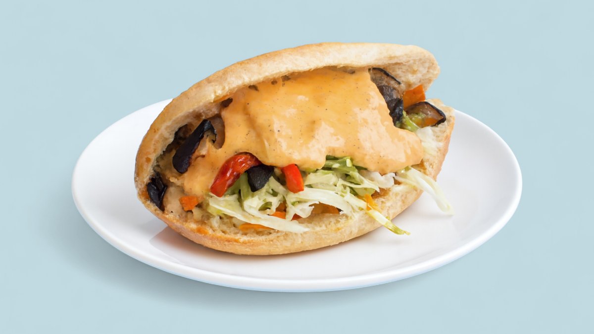 mit gebratenem Gemüse, Kalbfleisch oder Hähnchenfleisch, Salat (Tomaten und Gurken, Eisberg, Kraut und Zwiebeln) und Sauce (Tzatziki, Curry, Cocktail, Joghurt, Avocado und vegane Avocado). Von den Saucen sind nur zwei zur Auswahl.