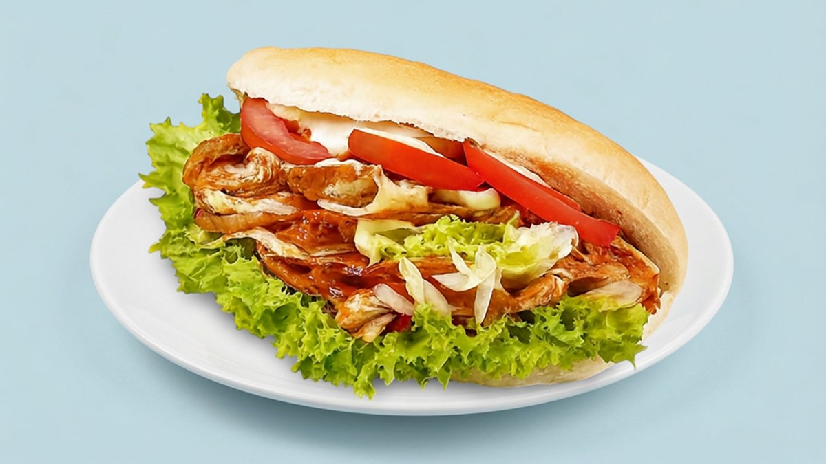 mit Kalbfleisch oder Hähnchenfleisch, Salat (Tomaten und Gurken, Eisberg, Kraut und Zwiebeln) und Sauce (Tzatziki, Curry, Cocktail, Joghurt, Avocado und vegane Avocado). Von den Saucen sind nur zwei zur Auswahl.