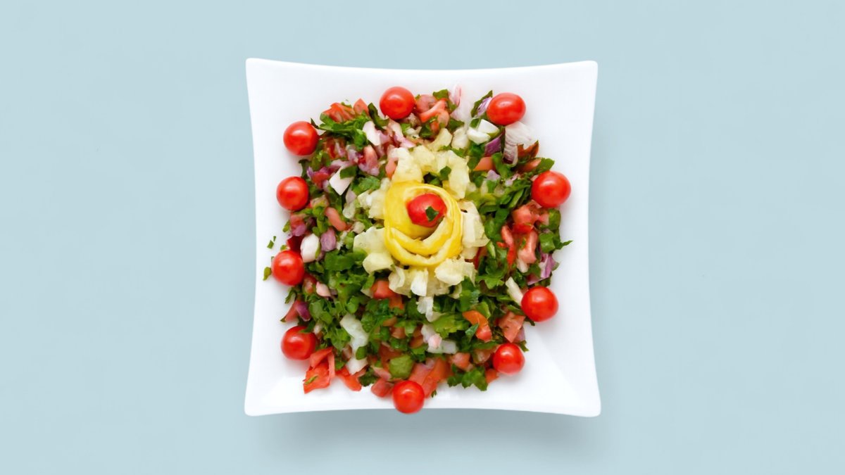 mit Salat (Tomaten und Gurken, Eisberg, Kraut und Zwiebeln) und Sauce (Tzatziki, Curry, Cocktail, Joghurt, Avocado und vegane Avocado). Von den Saucen sind nur zwei zur Auswahl.