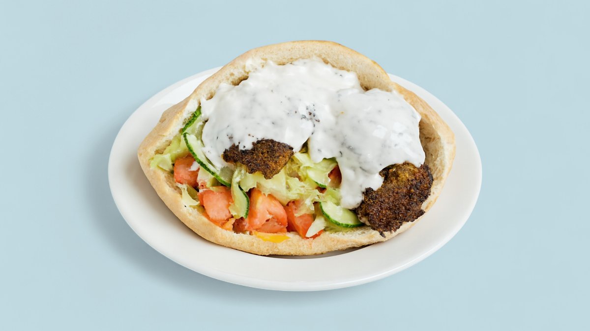 mit drei StĂĽck Falafel, Salat (Tomaten und Gurken, Eisberg, Kraut und Zwiebeln) und Sauce (Tzatziki, Curry, Cocktail, Joghurt, Avocado und vegane Avocado). Von den Saucen sind nur zwei zur Auswahl.