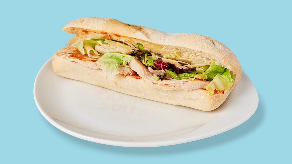 Ciabatta-Sandwich mit Caesar-Dressing, Hähnchen und Gemüse