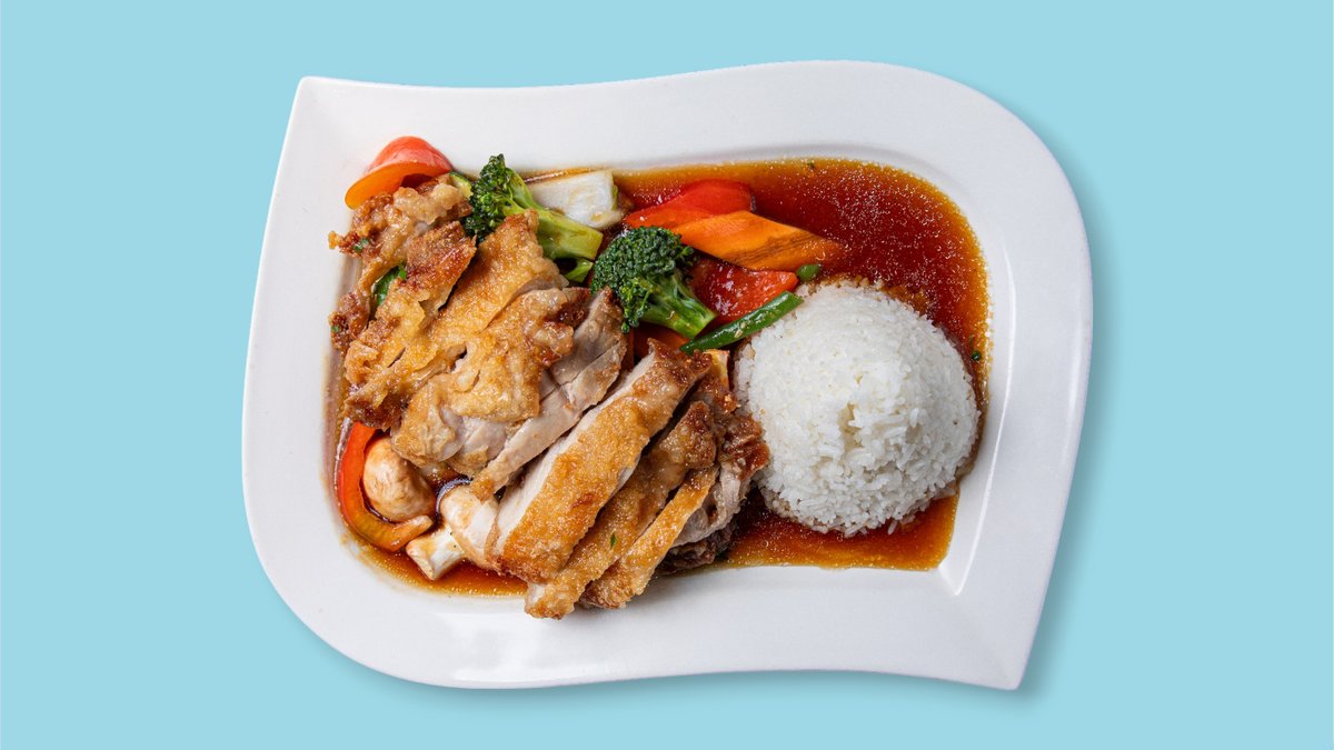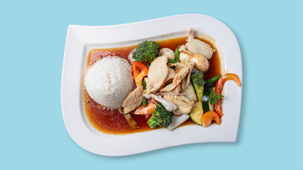 gefüllt mit Hähnchenfleisch und Gemüse, dazu süß-saure Chili-Soße